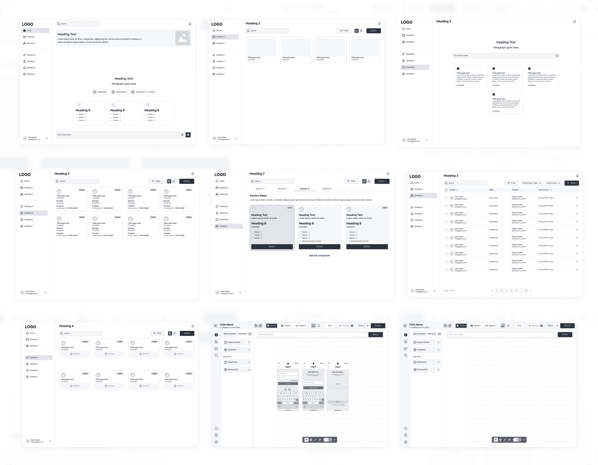 These screens document the complete design iteration process, showcasing the evolution from initial low-fidelity wireframes, through mid-fidelity prototypes, to the final high-fidelity mockups