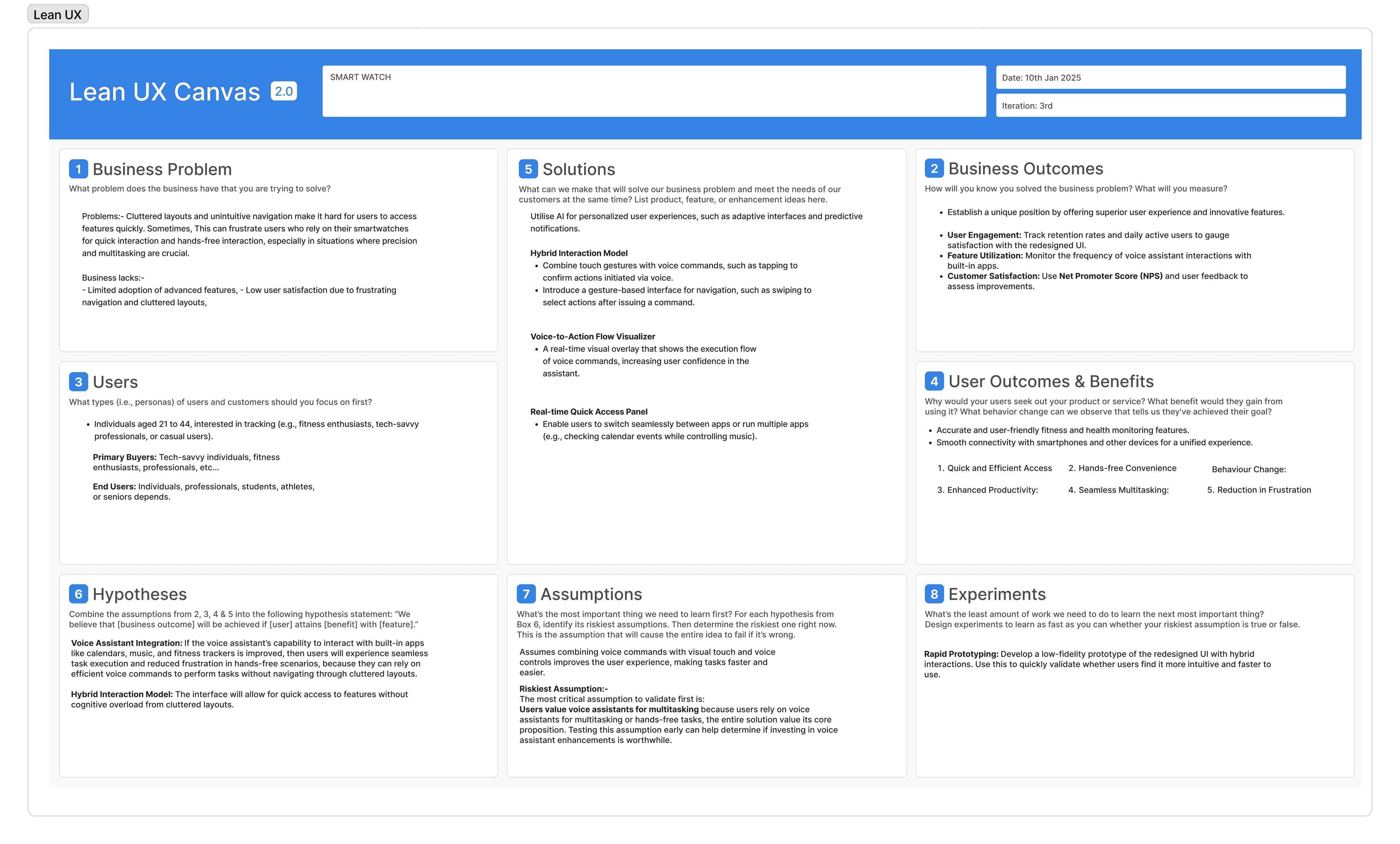 Starting with Lean UX Canvas by defining the Business Problem, Business Outcomes, Users, User Outcomes and Benefits, Solutions, Hypotheses, Assumptions and Experiments.